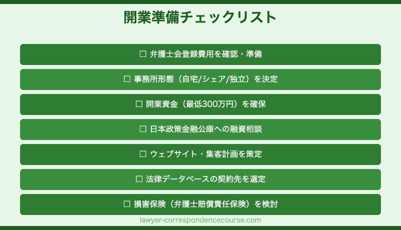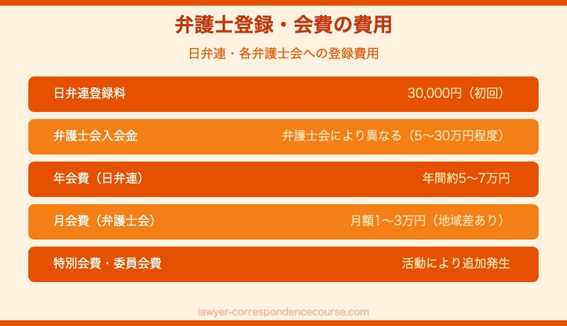 弁護士として開業するにはまず日本弁護士連合会への登録が必要です。登録料・弁護士会費の入会金など、初年度は10〜30万円程度の費用が発生します(弁護士会によって異なります)。 また毎月の弁護士会費(月額1〜3万円程度)も継続的なコストとして計算に入れておく必要があります。日本弁護士連合会(日弁連)のサイトで最新の登録費用を確認してください。