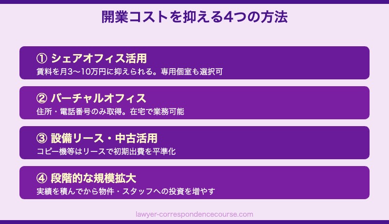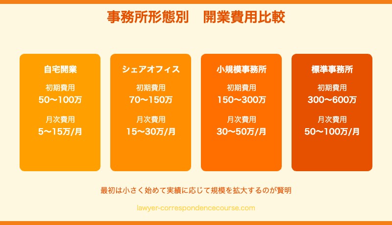 自宅開業やシェアオフィスを活用することで、初期費用を大幅に抑えることができます。弁護士登録費用20万円+設備費30万円+広告費20万円の合計70〜100万円程度での開業も不可能ではありません。 ただし、依頼人との面談スペースの確保や守秘義務の観点から、自宅開業には一定の工夫が必要です。