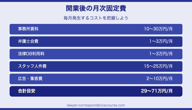 開業後も継続的なコストが発生します。主なものは、事務所賃料(月10〜30万円)、弁護士会費(月1〜3万円)、法律データベース利用料(月1〜3万円)、事務スタッフ人件費(月15〜25万円)、広告費(月2〜10万円)などです。 月次の固定費合計は最低でも30〜70万円程度になることが多く、収入が安定するまでの期間を想定した資金計画が重要です。