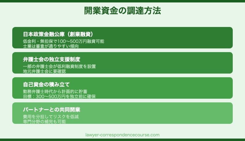 弁護士事務所の開業資金は、日本政策金融公庫の創業融資(低金利・無担保)を利用することができます。士業の開業は比較的審査が通りやすいとされており、100〜500万円程度の融資実績もあります。 また、弁護士会から独立支援のための融資制度が設けられているケースもあります。弁護士になるための費用と合わせて、総合的な資金計画を立てることをお勧めします。