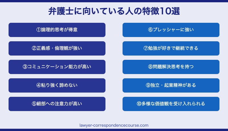 弁護士に向いている人の特徴10選をまとめると、論理的思考・正義感・コミュニケーション力・粘り強さ・細部への注意・プレッシャー耐性・勉強継続力・問題解決思考・起業精神・多様性受容です。 これらの特徴が完全に揃っている必要はありませんが、いくつかが当てはまれば弁護士として活躍できるポテンシャルは十分にあります。自分の強みを活かした弁護士像を描きながら、受験勉強を進めていきましょう。