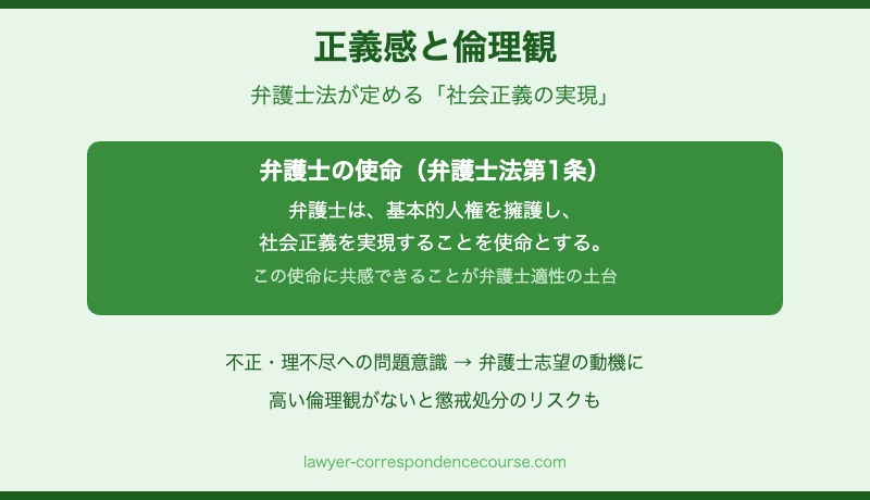 弁護士は依頼人の権利を守るために戦う職業です。不正や理不尽に対して強い問題意識を持ち、正しいことを貫く意志がある人は弁護士向きです。 弁護士法では弁護士を「社会正義の実現」を使命とする者と規定しており、高い倫理観は必須です。