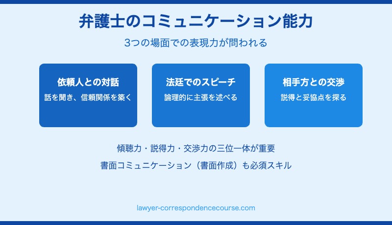 依頼人の話をしっかりと聞き取り、相手の立場に立って状況を理解する力は弁護士に不可欠です。また、裁判官・相手方弁護士・検察官などとの交渉においても、明確かつ説得力ある表現が求められます。 法廷でのスピーチ力だけでなく、日常の対話力が弁護士の仕事の質を左右します。