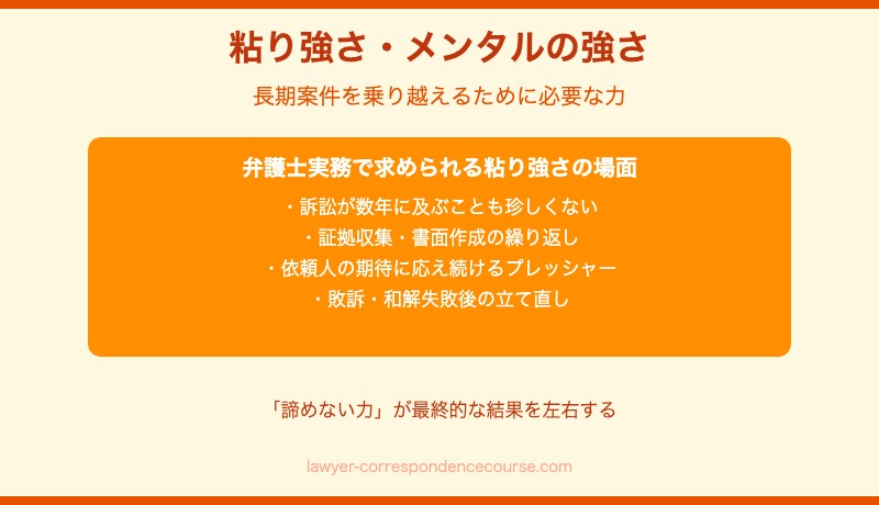 裁判の期日、交渉の締め切り、依頼人への報告など、弁護士は常に締め切りとプレッシャーの中で仕事をします。ストレス耐性があり、冷静な判断を保ちながら行動できる人は弁護士に向いています。 特に訴訟弁護士(リティゲーター)はプレッシャー下でのパフォーマンスが問われます。