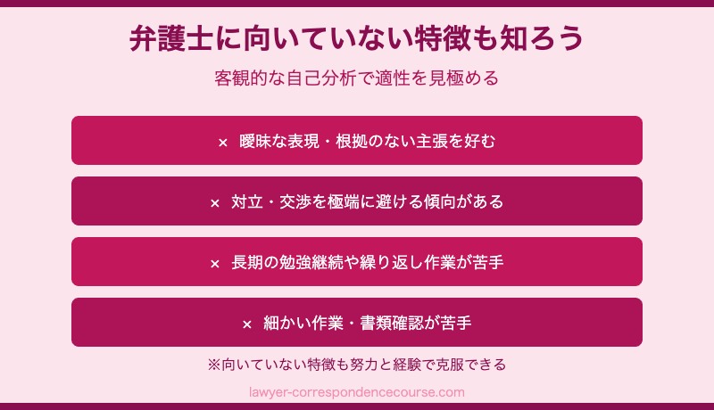 向いている人を理解する一方で、弁護士に向いていない特徴も知っておくことは大切です。主なものとして、曖昧な表現を好む・対立を極端に嫌う・長期の勉強継続が苦手・細かい作業が苦手といった点が挙げられます。 ただし「向いていない」と感じても、努力と経験によって多くの部分は克服できます。弁護士を目指す動機とビジョンが明確であれば、適性は後天的に養えるものです。