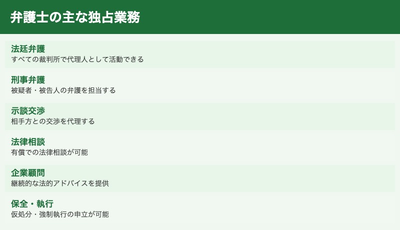法律相談・契約書作成・交渉・示談・裁判所への出廷・刑事弁護・企業法務など、法律に関わるほぼすべての業務を行えます。弁護士法3条により、その職務範囲は非常に広く設定されています。