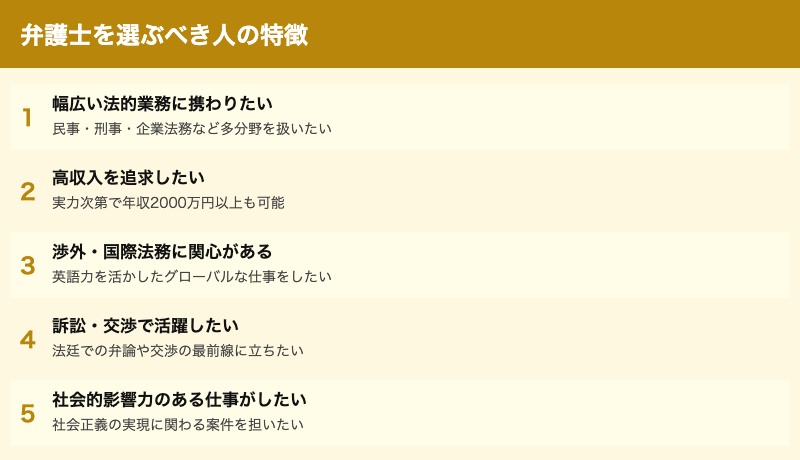 訴訟代理・刑事弁護・企業法務など幅広い法的業務に携わりたい場合は弁護士を目指すべきです。また、高収入を追求したい方・渉外法務や国際案件に関わりたい方にも弁護士の方が向いています。