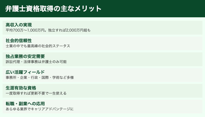 弁護士資格を取ることのメリットは、高収入・社会的信頼性・活躍フィールドの広さ・独占業務による需要の安定など、非常に多岐にわたります。