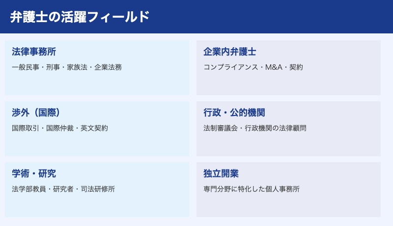 法律事務所での勤務・企業内弁護士・独立開業・研究職・行政機関への転身など、様々なキャリアパスが開かれています。