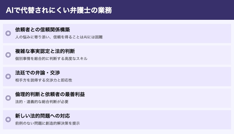 しかし、依頼者の個別事情を把握した上での総合的な法的判断・交渉・裁判対応は、高度な人間的スキルを必要とします。