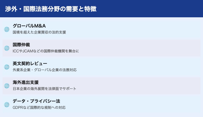グローバル化の進展に伴い、国際取引・国際仲裁・クロスボーダーM&Aを扱う渉外弁護士の需要も増加しています。