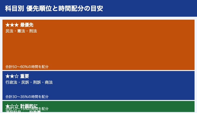 一般教養は対策に時間をかけすぎず、法律科目の底上げを優先します。