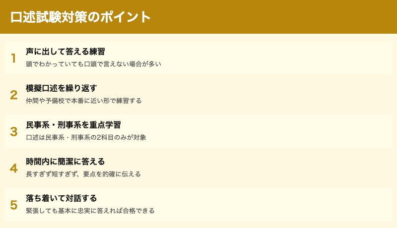 口述試験は試験官と直接対話する形式で実施され、民事系・刑事系の2科目が問われます。