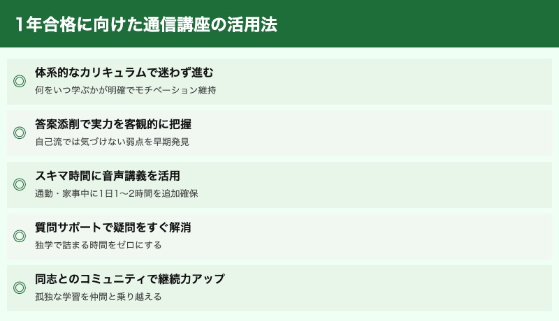 優れた通信講座を活用することで、独学では気づきにくい重要論点・効率的な答案の型・科目ごとの優先順位を短期間で習得できます。