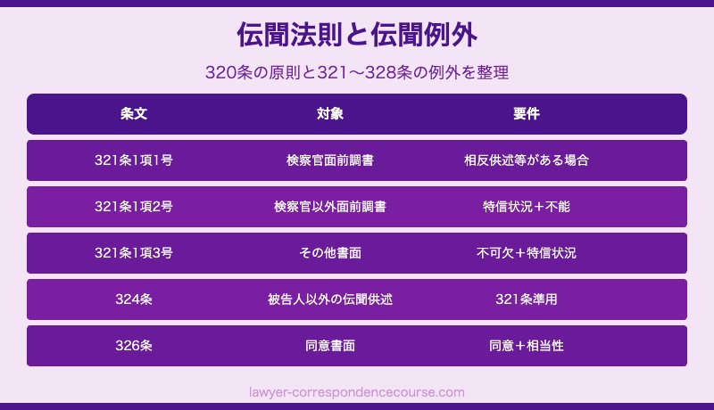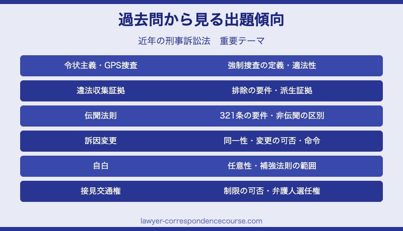 伝聞証拠(刑訴320条)の意義と、各種伝聞例外(321〜328条)の要件を整理することが重要です。「原供述者が証人として尋問できない」などの要件をどの条文に基づいて論じるかが問われます。 伝聞・非伝聞の区別が曖昧なまま答案を書くと、論点を取り違える危険があるので、事例で繰り返し練習しましょう。