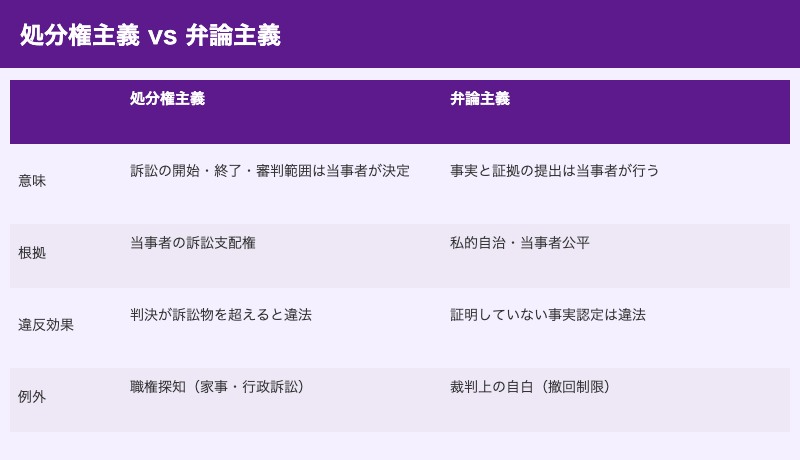 処分権主義(訴訟の開始・終了・審判範囲は当事者が決める)と弁論主義(事実の主張・証拠の提出は当事者が行う)は、民事訴訟の根本原則であり、最頻出論点です。両原則の内容・根拠・例外を正確に押さえましょう。