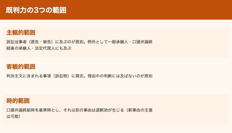 既判力とは、確定判決の判断内容が後訴を拘束する効力です。既判力の範囲(主観的範囲・客観的範囲・時的範囲)と遮断効は、論文で頻繁に問われます。特に「一事不再理」「信義則による拡張」は深く理解が必要です。