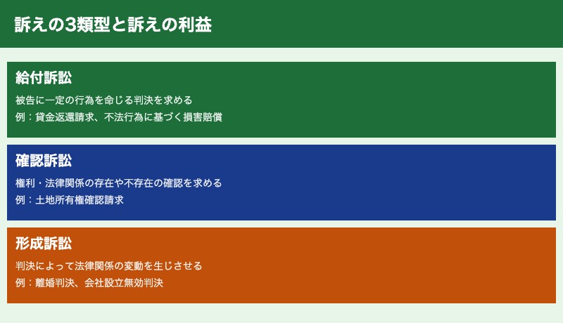 給付訴訟・確認訴訟・形成訴訟の3類型と、各類型の訴えの利益の要件も頻出です。特に確認の利益(確認訴訟の適法要件)は論文での出題が多く、丁寧な論述が求められます。
