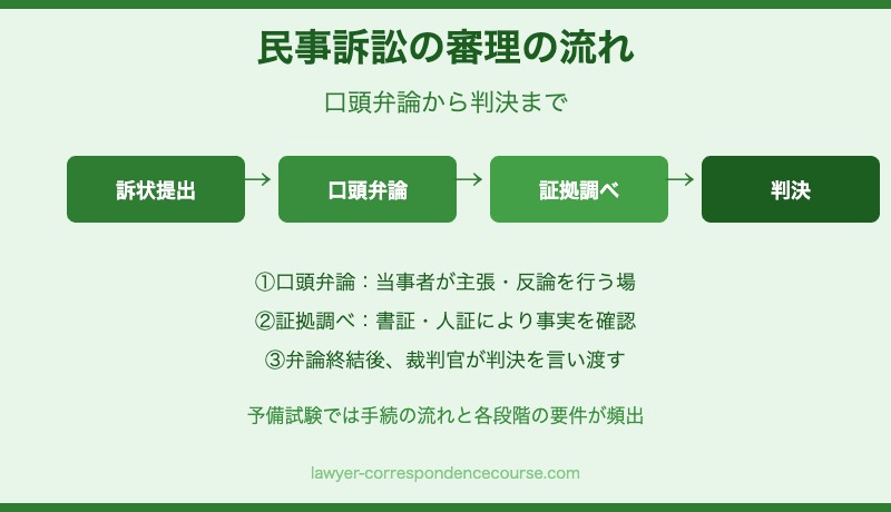 論文式では「処分権主義・弁論主義」「既判力の範囲・遮断効」「上訴の利益」「証拠法則(自白・自由心証)」が頻繁に出題されます。短答式では手続きの要件・効果・期間に関する条文知識が問われます。短答式対策の詳細は予備試験の短答式対策の記事もご参照ください。