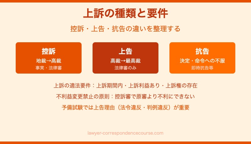 共同訴訟(通常・必要的)・補助参加・訴訟告知・第三者の訴訟参加、控訴・上告の要件と不利益変更禁止の原則も重要論点です。民事保全(仮差押え・仮処分)の要件も確認しておきましょう。