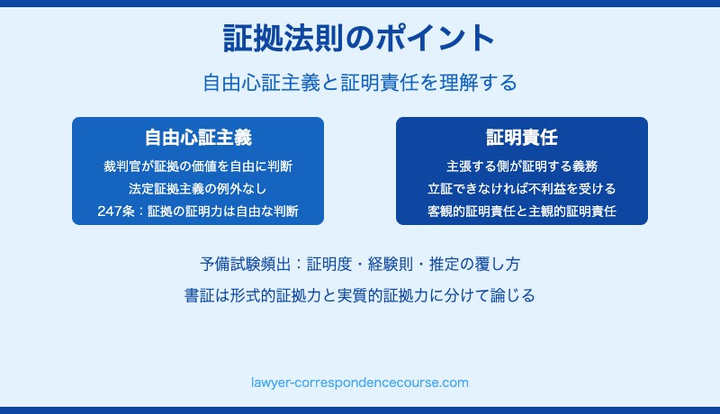 自白の拘束力・撤回の可否、自由心証主義の意義と限界、証明度・事実上の推定なども頻出テーマです。実体法(民法)の事実認定と手続き法(民訴法)の証拠法則の関係を理解することが重要です。
